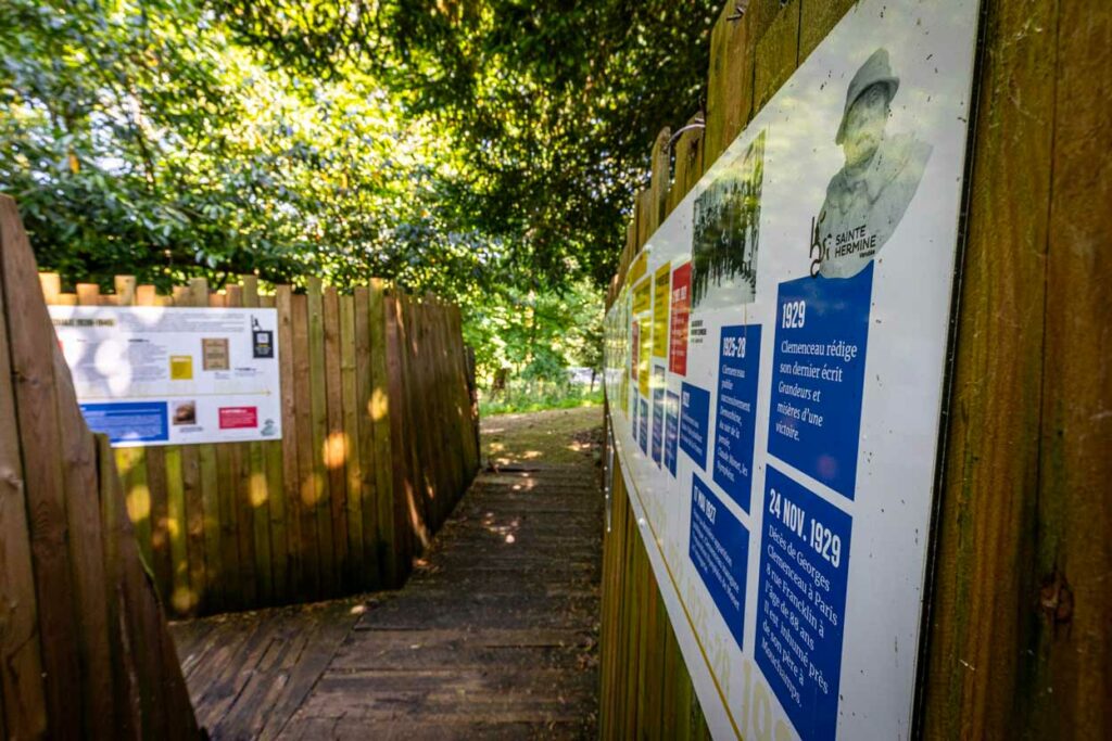 Nous avons eu la chance de travailler sur ce projet en équipe avec le conseil des sages de la Mairie de Sainte-Hermine. La réalisation s’est faite en partenariat avec les Ateliers Chenu. Nous avons également réalisé le site web du parcours en équipe avec le conseil des sages. Il est aujourd’hui rattaché au nouveau site de la mairie également conçu par nos soins. www.sainte-hermine.fr/parcours-clemenceau/.